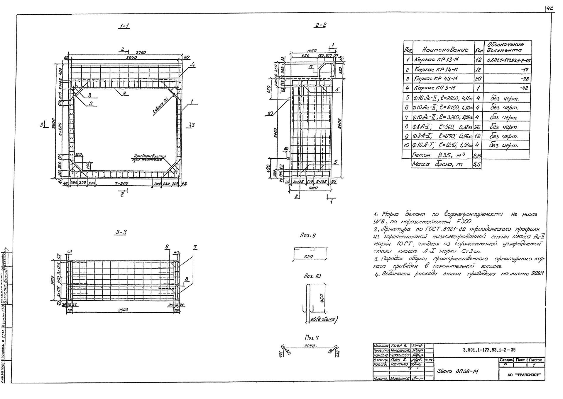 Трубы водопропускные и оголовка ЗП 36-М для прямоугольных водопропускных труб изготавливаются в соответствии с ГОСТ 24547-81 «Звенья железобетонные водопропускных труб под насыпи автомобильных и железных дорог», ОСТ 35-27.0-85 «Звенья железобетонные круглых и прямоугольных водопропускных труб под железные и автомобильные дороги» из тяжелого конструкционного бетона. Класс бетона по прочности на сжатие принимается не ниже В15. Класс бетона по морозостойкости назначается в зависимости от климатического района строительства не ниже: F200 – при средней месячной температуре воздуха наиболее холодного месяца в районе строительства выше -15˚С; F300 – при средней месячной температуре воздуха наиболее холодного месяца в районе строительства ниже -15˚С. Класс бетона по водонепроницаемости принимается не менее W6. Дополнительно в бетонную смесь изделий вводятся вохдухововлекающие, газообразующие и пластифицирующие добавки для сопротивления воздействию агрессивных химических веществ, содержащихся в воде и грунте.